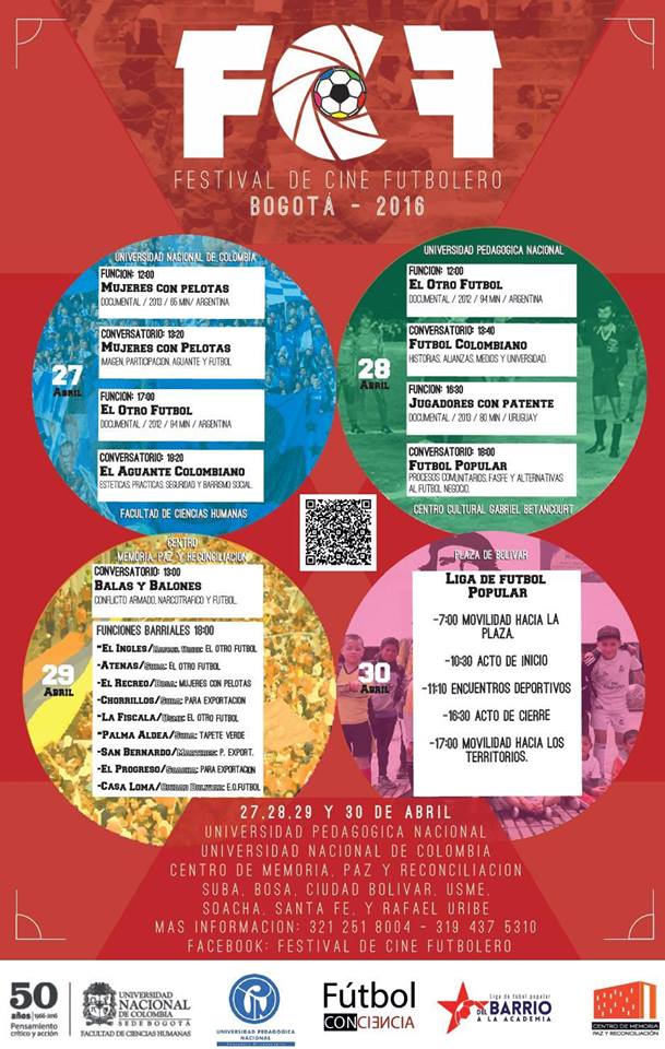 Hacemos cordial invitación al “FESTIVAL DE CINE FUTBOLERO” que se llevará a cabo del 27 al 30 de abril, organizado en esta primera versión por el colectivo “Fútbol conciencia” que se está conformando y que actualmente tiene por miembros estudiantes y egresados(as) de las Universidades: Nacional (UN), Pedagógica (UPN) y Distrital (UD), en áreas como Administración, Trabajo Social, Antropología, Ciencia Política, Sociología, Educación Comunitaria, Ciencias Sociales y Educación Física, además de integrantes de barras futboleras (América, Millonarios, Santa Fe y Nacional) y escuelas de fútbol popular que se han extendido por varias localidades de la ciudad de Bogotá y Soacha, dando la posibilidad a niños y niñas de compartir de manera gratuita espacios deportivos y de formación íntegra.